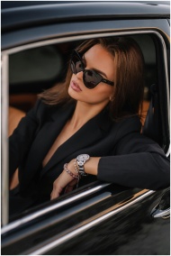 Elegant woman wearing sunglasses, seated in a luxury car, exuding style and sophistication.