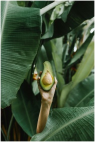 A hand holds a cut avocado amidst large green bana