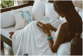 An African American woman in a white dress writing in a notebook while sitting on a sofa indoors.