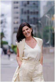 Smiling woman in a cream outfit posing confidently in a city street.