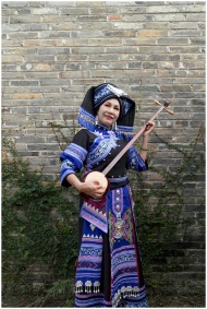 Zhuang woman in colorful traditional attire with string instrument, showcasing cultural heritage.