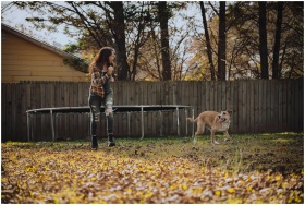 A woman enjoys a playful moment with her dog in a sunlit autumn backyard.