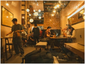 Warm and inviting coffee shop interior with people working and socializing, evening ambiance.