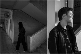 Moody black and white scene with two individuals in an indoor, urban setting.