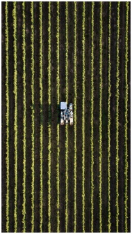 Aerial view of a tractor working in neat rows of a