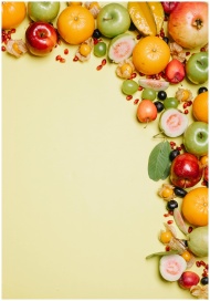 Fresh and colorful assortment of tropical and exotic fruits arranged on a bright yellow background.