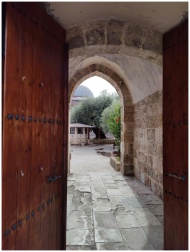View through ancient doors into a mosque courtyard