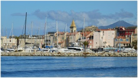 Charming harbor scene with boats and historic buildings in Saint-Florent, Corsica.