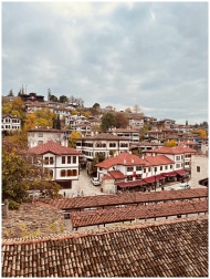 Classic Ottoman architecture in a hillside town with red-tiled roofs on a cloudy day.