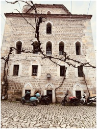 A vintage stone building facade with scooters parked below winding, bare vines.
