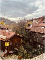 Charming view of rustic rooftops in a village under overcast skies.