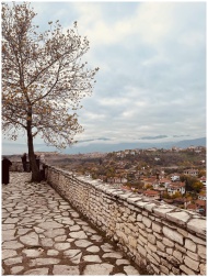 Picturesque view from a stone terrace over a historic town with autumn leaves.