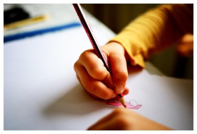 Flat lay of colorful notebooks, pen, and fuzzy pom