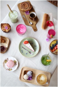 Vibrant flat lay of assorted desserts and beverages on a table setting, perfect for food photography enthusiasts.