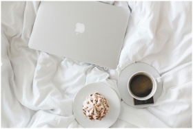 A serene morning setup with a laptop, coffee, and cake on a bed, embodying comfort and relaxation.