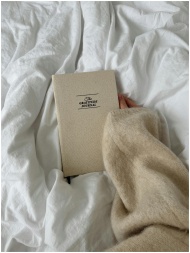 A close-up of a hand holding a gratitude journal on a soft bed, conveying warmth and reflection.