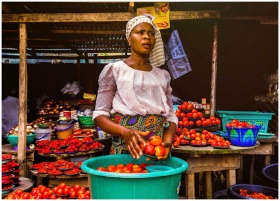 Woman selling fresh tomatoes at an outdoor market stall, showcasing vibrant produce.