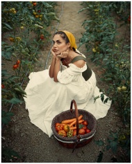 Young woman in a tomato field with a basket of fresh vegetables, wearing a vintage dress.
