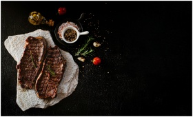 Delicious grilled steak served with rosemary, garlic, and spices on a stone slab, perfect for a gourmet meal.