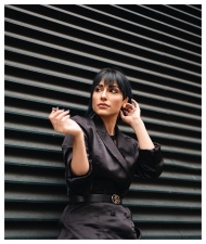 A modern portrait of a woman in stylish black atti
