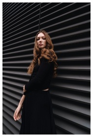 A modern portrait of a woman in stylish black atti