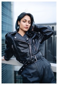 A modern portrait of a woman in stylish black atti