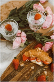 Flat lay of a picnic setup with croissants, strawberries, and pink flowers, creating a French elegance.