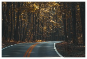 A scenic winding road through a vibrant autumn for