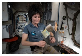 Astronaut Samantha Cristoforetti poses with food p