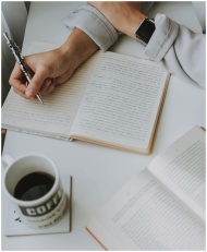 A person writing in a notebook with a cup of coffee and an open book on a white table.