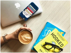 Overhead view of a workspace featuring books, coffee, and a smartphone on a wooden table.