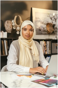 Confident woman wearing hijab working on a laptop