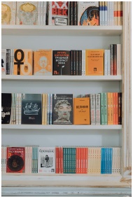 A vibrant collection of books displayed on a decorative white bookshelf.