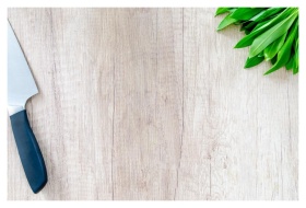 Fresh herbs and a chef knife on a wooden surface w