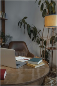 Inviting home office setting with laptop, books, and a plant creating a warm atmosphere.