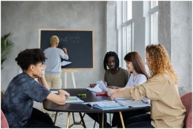Unrecognizable male writing mathematical equation on chalkboard in classroom with group of multiethnic student at table solving task during lesson