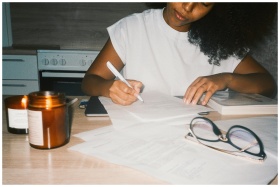 A black woman focused on remote work, writing notes by candlelight at home.