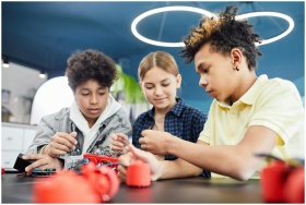 Diverse teenagers collaboratively working on a rob