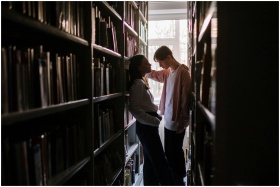 Two young adults having a discussion in a library aisle with natural light filtering in.