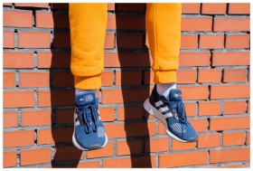 Casually dressed man sitting on a brick wall. He’s wearing trendy sweatpants and stylish sneakers. This photo encapsulates urban lifestyle, street fashion, and modern leisure. Ideal for themes around city life and men’s fashion.