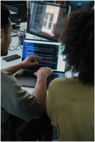 Two adults collaborating on programming tasks using a laptop in an office setting.