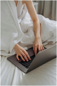 Adult woman comfortably typing on a laptop while sitting in bed covered with white linens.