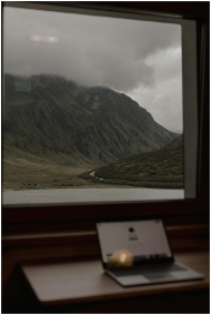 Quiet workspace with laptop overlooking foggy mountains in Tirol, Austria.