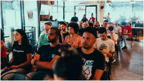 A diverse group of adults attentively participating in an indoor seminar or conference.