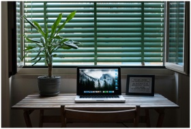 Elegant home office desk setup with a laptop and a plant near a window. Ideal for remote work.