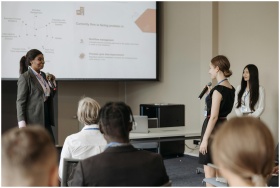 Corporate conference scene with women presenting a