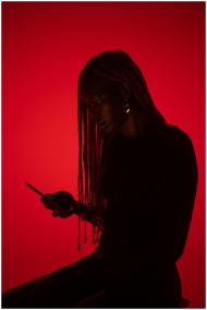 Silhouette of a woman with braids focused on her cellphone against a red background.
