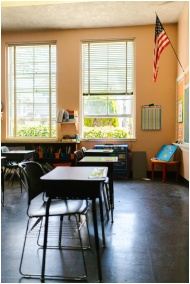 A peaceful classroom with empty desks, American fl