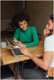 Two adults collaborating at a wooden table with laptops and phones in a cozy indoor setting.
