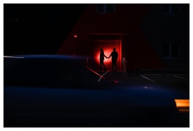 Silhouetted couple sharing a kiss in a dimly lit c